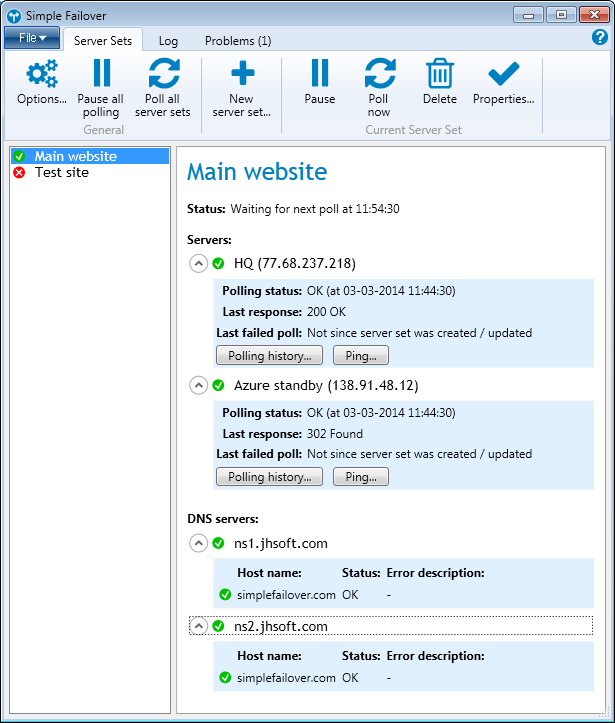 Each server set in the list (left) also has an icon indicating the current overall status of the server set: green / check mark = all ok, red / cross = one or more problems, grey / ? = unknown status.