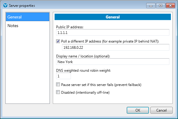 In this section of the Server properties dialog, you can specify the general settings for a server: