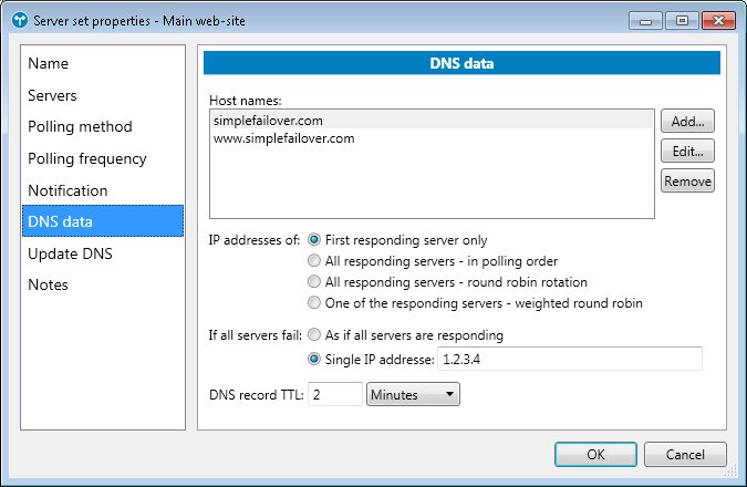 These values are used when Simple Failover serves DNS requests directly (see Options dialog / DNS serving section), and/or when updating DNS servers for this server set (see Server set properties / Update DNS section)