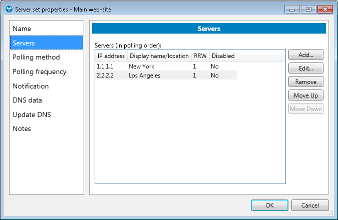 In this section of the Server set properties dialog, you can specify the individual servers that make up the server set: