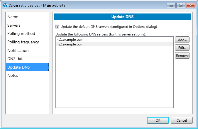 Enable this to update the default DNS servers configured in the Options dialog / DNS updating section for this server set.Update the following DNS servers (for this server set only)