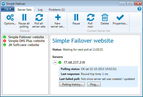 Quick recap: Simple Failover is a software package, installed on your own computer(s), which continuously monitors your servers (web, mail, ftp, or any other type of server connected to the network), notifies you of any problems, and (optionally) updates your DNS records so that your domain name always points to a functional server.